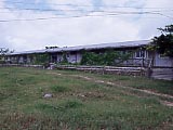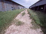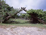 | もうしばらく行くと右側に木組みのアーチがあった。 | 建物の残骸。 | 道はまっすぐ南へ続く。 | 右側には島の住民や、寝泊まりする人用の宿舎。 正式な人口は2人。 店もなく「嗜好品が食べたくなるよ〜。」だそうだ。 そうだよなー。 |