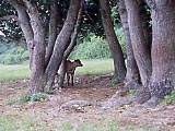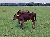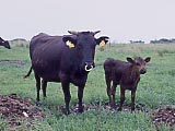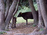 | 牛がいっぱい。 | ちょこまかと母牛に付いて歩く仔牛。 | 木陰の仔牛にも母牛がいた。 | 親子。 親牛は250頭ほどいるらしい。 |