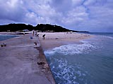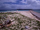 桟橋の根元からビーチ方向を撮影。 写真左上の白い点点は、ワンボックスカーにしまってあるパラソル。 客はその下で、1日のんびりゴロゴロする。 |