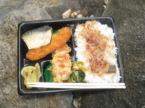 | 岸壁の根元近くの木陰でお昼〜。 お弁当もことのほかまーさんよ〜。 |