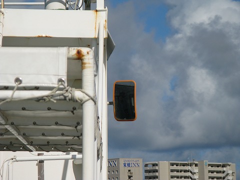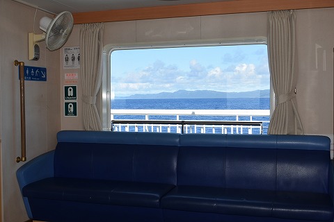 | 俺は船室内後部の優先席で、 センプーキを回しながら快適に過ごしていた。 乗船前は、空調のトラブルで冷房が効かないか、 極く弱くしか効かないことがある、と聞かされていたので ちょっと心配だったが、幸い冷房は効いていた。 写真は、西表島沖を航行中に撮影。 |
