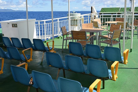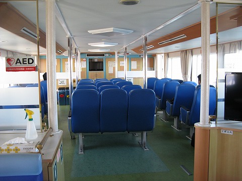 | 車両甲板 | 船室。 リニューアルされたようで、きれいだ。 客は俺を入れて7人か。 |