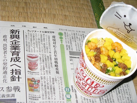 | 石垣島での朝メシは 誕生から50年と2日を迎えたカップヌードル。 50周年+1日である19日に買ってあったんだけど、 喰う機会を逃していた。 どうせなら、前日の晩メシは大盛UFOではなく、 こっちにするべきだったと、ちょっと後悔(笑)。 これまでの石垣島での様子はこちら。 |