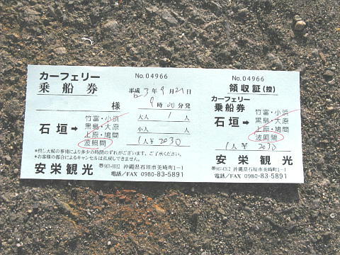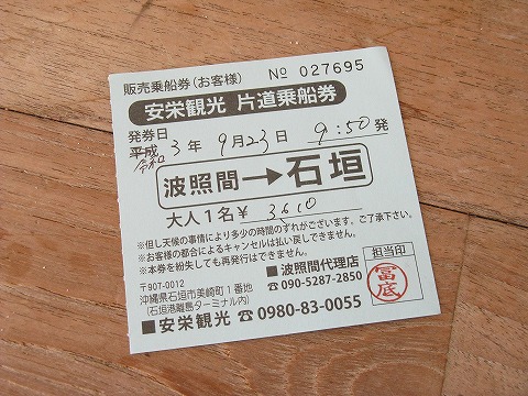 | 石垣行きのチケット。 | 高速船「ぱいかじ」のシート。 新幹線みたいだが、リクライニングはしない。 荒天の高波で船がバウンドすることもあるので、シートベルト付きですぜ。 あ、宿の共用冷蔵庫に水とオリオン缶を冷やしたまんま忘れてきた… (石垣島に着いたら宿に連絡して、テキトーに呑んでと伝えたよ。)。 さあ、石垣島に帰ろう。 波照間島にはまた潜りに来たいね。 続きの石垣島はこちら。 |