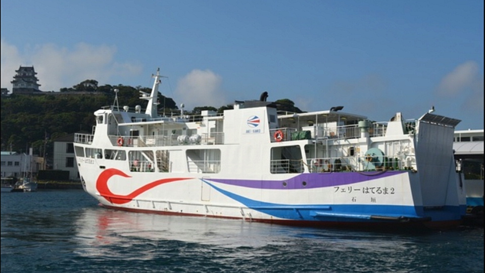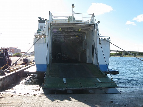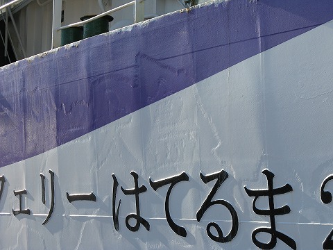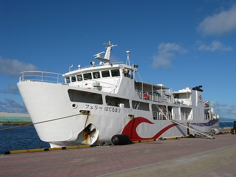 「フェリーはてるま2」。 199トンの小さな船。 小さいとはいえ離島ターミナルには入れないので、 ターミナルから港をぐるっと回った反対側のフェリー発着所で乗船する。 |