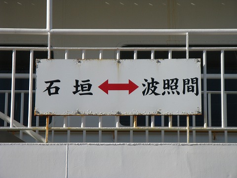 | テツ的にいうところの「サボ」。 | 船尾の船名の部分をよく見たら「大島」の文字が確認できた。 波照間島の宿に着いてからネットで調べてみたら、 2005(平成17)年12月?〜2019(平成31)年1月まで 長崎県平戸市の平戸市営航路(的山(あづち)大島〜平戸)の 「第2フェリー大島」として就航していたんだね。 この船は長崎県内で波照間航路用として安栄観光カラーに 化粧直ししたところで、新造船にトラブルが発生したため、 また大島航路に一時的に復帰していた、とネット記事にあった。 |