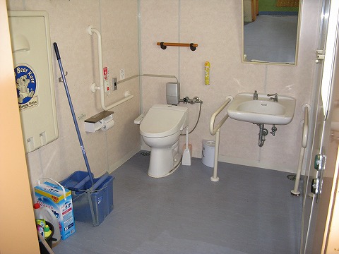 | 船尾の甲板の座席。 | 多目的トイレ。 掃除用具置き場を兼ねているようにも思える(笑)。 |