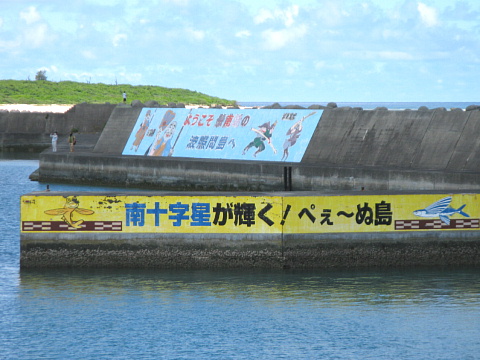 | 防波堤のペイントが歓迎してくれる。 ちなみに「ぺぇ〜ぬ」とは「南の」の意。 「ぱいぬ」と同じ。 |