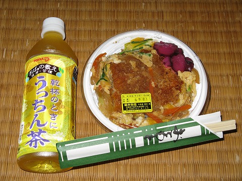 | 着いたのがちょうど昼時だったので、 宿のすぐ近くのまちぐゎでかつ丼を買ってきて昼メシ。 |
