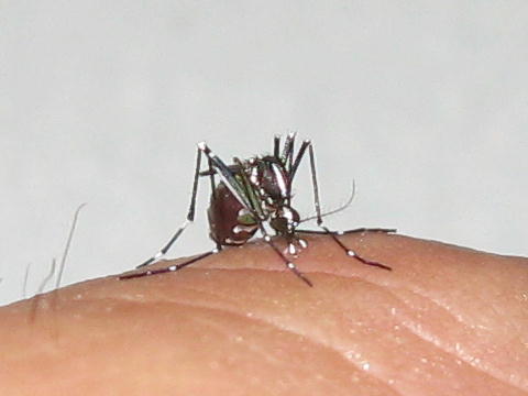 | 部屋にはどこかから蚊が入ってきて俺のことを刺しまくる。 血を吸うのは交尾を終えたメスのみだそうで、 「妊娠した女王様蚊にワタクシの血を吸っていただけるなんて 幸福至極でございますぅ〜!」 なんて感情にはならず、暑くてイライラしていることもあり、 この写真を撮影した数秒後に、 俺の血でハラが膨れているこの女王様蚊を殺害した(笑)。 鮮血が飛び散ったぜ(厚さでおかしくなってるな、俺。)。 【後日追記】 正しくは「暑さ」ですね。 おかしくなっていたようなので、あえてそのままにしときます。 |