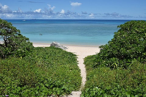 | ニシ浜。 素晴らしい海の色。 ダイビングボートが停泊しているね。 海面の点々はシュノーケラー。 向こうの島は中御神島(なかのかみしま・なかのうがんじま、など。 文字は国土地理院に習った。)。 中御神島にはダイビングポイントもあるようで、 前から潜ってみたいと思っている。 |