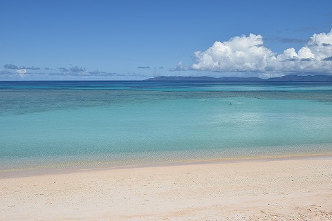 ニシ浜。 向こうの島は西表島 海面の点々はやはりシュノーケラー。 さて、とにかく暑いので、これでいったん宿に戻って シャワーを浴びたりホヘッとして仕切り直そう。 |
