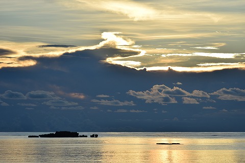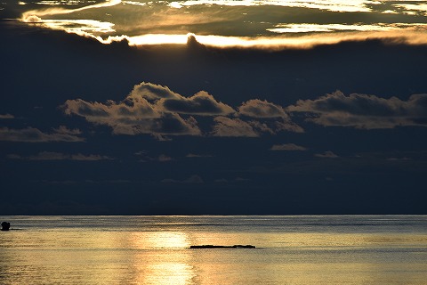 | 水平線より上は、手前の小さな浮雲の向こうで 厚い雲が覆っていた。 |