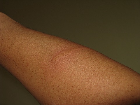 | やっぱり暑くて6時半頃目が覚めた。 早速蚊が刺してきたので殺害したのだが、 蚊の針が腕に刺さったまま放っておいたら、 こんな細長く腫れてしまった。 かい〜の、かい〜の。 |