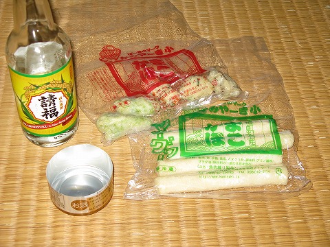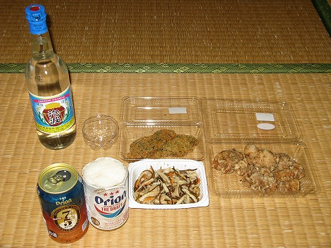 | さて、今日の晩メシ。 夕方にまちぐゎで確保しておいた。 ・鯖の磯辺フライ的なもの ・スパイス鷄空的なもの(ちょっとしょっぱい) ・酢の物 をツマミに、オリオンでかりー。 ちなみに、お惣菜は全て波照間島内で作られたもの。 そして、オリオンが終わったら、「泡波」が控えているのだよ。 三合瓶の右に置いてある「ガラスのさかずき」的なものは、 昼間に飲んだポカリのペットボトルを 裁縫セットに入っているはさみで切って下部を活用したもの。 グラスっぽいでしょ(笑)。 今晩は暑さに負けてエアコンを使っているので、 湿度の低い部屋で快適に呑める。 |