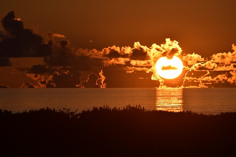 | 波照間島の東側は、海っ端にはなかなか簡単には出られないので、 逆に少し高さを稼いで、サトウキビ畑の脇道に来て撮影。 昨日の夕日はダメだったが、今日の朝日が見られたからよかったよ。 |
