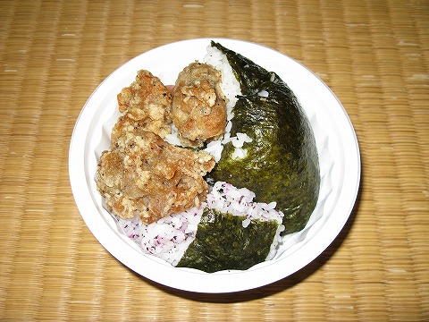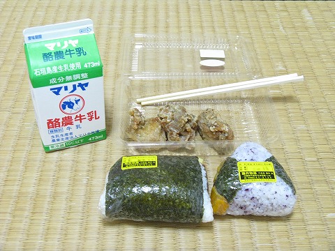| 宿に戻ってきた頃に7時になったので、 まちぐゎで朝メシ用におにポー200円ナリとしそおむすび100円ナリ をGETしてきた。これに、昨日の残りの鷄空を合わせて…。 |