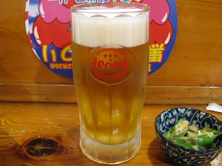 2軒目はいつもの「南の島(ぱいぬしま)」 に呑みに行く。 この店は最近は人気が出てきて、 カウンターでも入れないことが多く、 結局覗くこと5回目にして、やっと入れた。 嬉しいことに店の人は俺を憶えていて くれているので、「すみませんねぇ」 と言ってくれるのが嬉しい。 一杯目は、オリオンの生で、 くゎんぱ〜い。 |