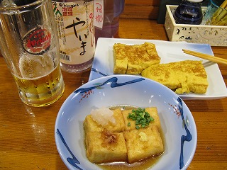 | アフターダイブは、昨日と同じ 「南の島」でうだうだと。 ピリ辛卵焼きと、島豆腐の揚げ出し。 どっちも、で〜じま〜さんどー。 |