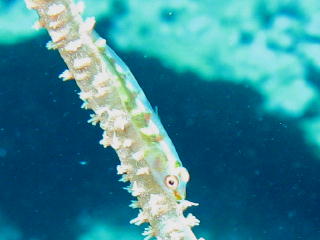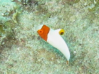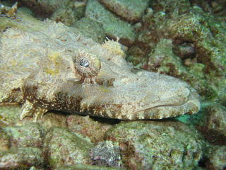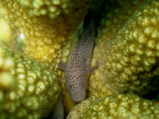 サンゴの間に挟まっている ダンゴオコゼ、 マヌケ顔が何ともいいね。 |