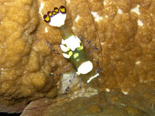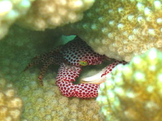 | オオアカホシサンゴガニが サンゴの陰からコソッとこっちを 睨んでいる(笑)。 |