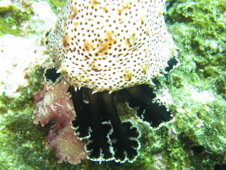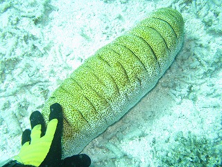 | 1本目を開始してすぐにいたナマコ。 フランスパンみたいでしょ。 大きさが分かるように 俺の左手を添えている。 コイツを持ち上げたりひっくり返して 寄生しているエビを探したりして、 こねくり回す。 |