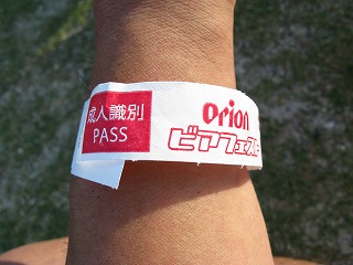 成人の証拠として リストバンドが巻かれる。 これを巻いていないと ビールが買えないよ〜。 |
