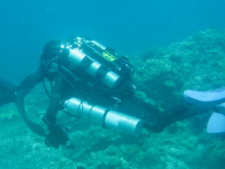 このダイバーは細めのタンクを 3本持ち込んでいる。 |