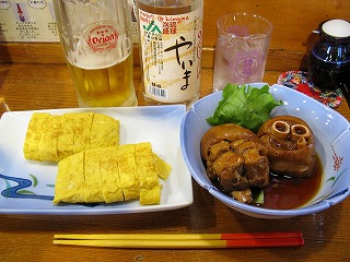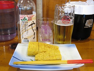 | 石垣島でのダイビングが終わり、 ナツのやいまが終わった…。 最終日も「南の島」で呑む。 3日連続で、まずはピリ辛卵焼き。 |