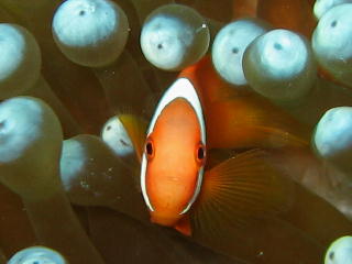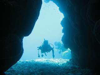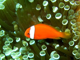 | おひる〜 | 2本目は嘉弥真島の北西 の洞窟ポイント。 洞窟にアプローチする途中に、 かわいいハマクマノミの子供がいた。 |