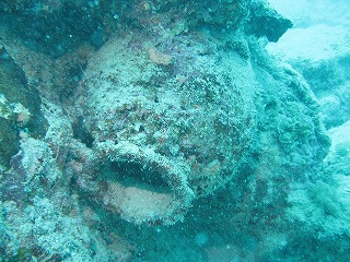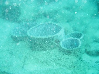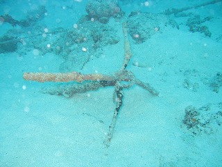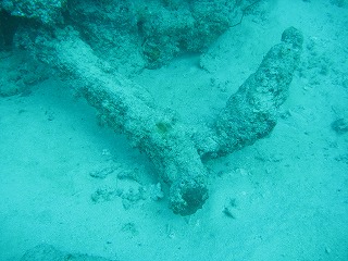 | 石垣島での1本目は 「本当の」海底遺跡。 昔の船の碇や陶器類が沈んでいる。 少なくとも100年以上前の物は 「水中文化遺産」と定義しているらしい。 これは「四爪鉄錨」。 下の2本は海底に埋まっている。 |