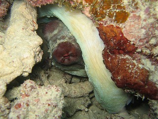 | シマダコ。 岩の陰に隠れている、というか、 岩の外にいるのを俺が見つけて カメラを構えてタコさんに 向かって行くから隠れちゃうんだね。 |