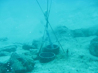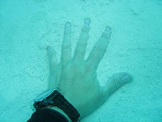 | 何やら「調査中」だそうで。 | 湧き出し口以外にも、 海底の砂が盛り上がっているところから 温泉が出ている。 |