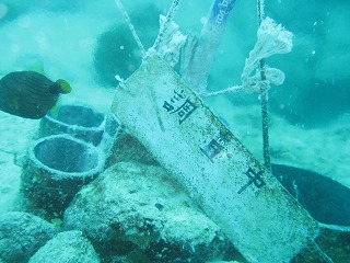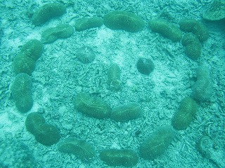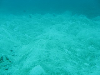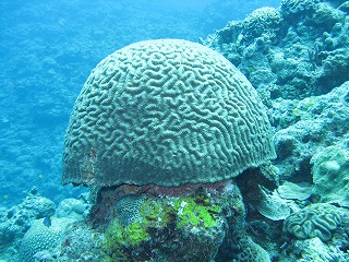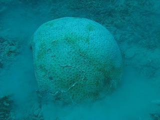 | 1本目は砂地とガレ場のポイントで潜る。 何か生物がいるかと思って、 ただのサンゴに見えた平べったいのを ひっくり返してみたら、なんとキクメイシだった。 なかなか立派で、できれば欲しかったな〜。 ちょっと大きすぎた。 |