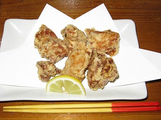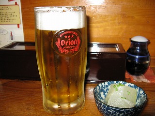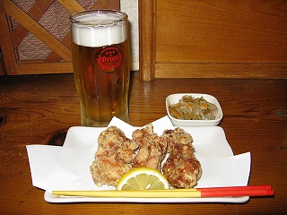 | 2日目のダイビングも終わり、 18時まで宿でガマンにガマンを重ねて、 やっと「南の島」へ呑みに出かけた。 昨日の経験から、今日は早速、 オリオン生と「とりから」を一緒に出してもらった。 そしたら、これが合うんだね。 この「とりから」で、生を2杯空けちゃった。 |