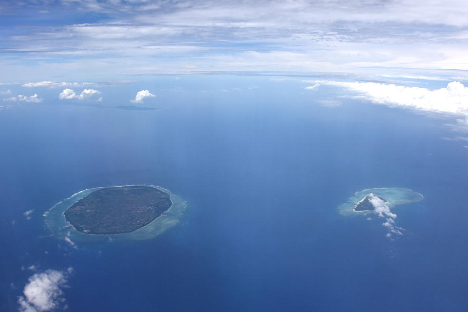 | 多良間島(写真左下)の東上空から、 石垣島(写真左上)の北端も見えた。 両方の島が見えたのは初めてだよ。 写真右下の雲がかかっている三角っぽいのは、水納島。 小さい写真だと分かりにくいので大きいのにしました。 |