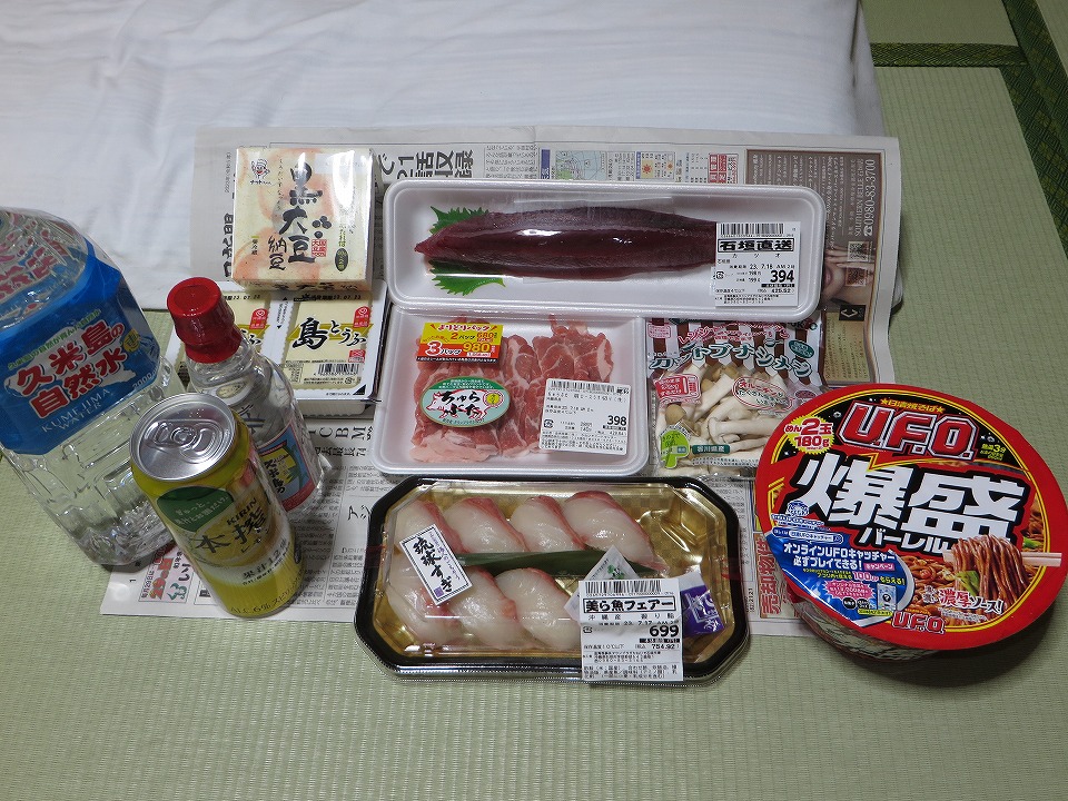 | 明けて次の日。 まったくなんの予定も入れていない。 こんなこと、台風で閉じ込められた時以外では初めてだ。 最初はこの日もダイビングするつもりだったんだけど、大人しくする日を作ってみようとフト思い、完全オフの日にしたのである。 昔ならもったいなくてこんなことはできなかったから、今日も潜ることにしたんだろうけど、トシ取ってきたってことなのかな。とほほけきょ。 朝メシと昼メシにUFOのを半分ずつ作って喰った以外は、宿で画像整理などをしてゴロゴロと過ごしていた。 オフもなかなかいいもんだと思ったよ。 昼を過ぎて、スーパーに今度はおみやを買いに行く。 |