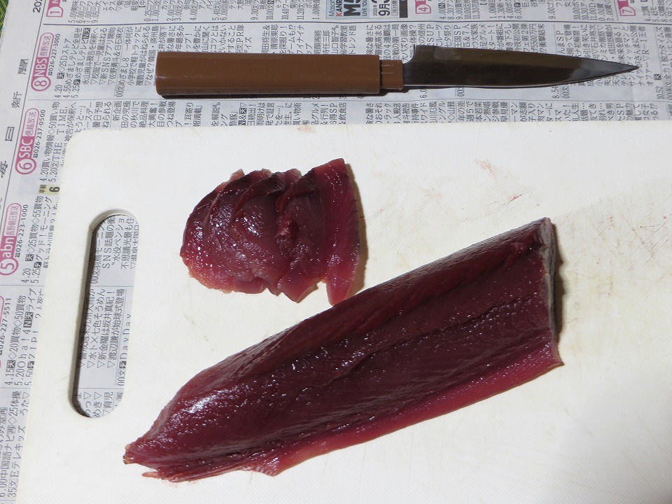 | 地元石垣島産のカツオがあったので迷わずGETしてきた。 獲れたてとまではいかないが、十分な歯ごたえがあって、やっぱり内地のものとは格段に違うんだよね。 でーじまーさんまーさん。しまーが進むさ〜。 以前「高知産も喰ってみたい」とコメントしたことがあったが、コメント後に俺が高知で喰った刺身はなかなか旨かったものの、 この石垣島産や、与那国島で食した獲れたてのものには、やはり及ばなかった。 俺はギッチョなので、包丁(ナイフ)はこう置きます。 身の左側から引くべきだったよね。この時点で結構呑んでるからてーげーだ。 あ、酔っ払って鍋の写真を撮り忘れた。 「ちゅらぶた」と島豆腐の鍋だったよ。 |