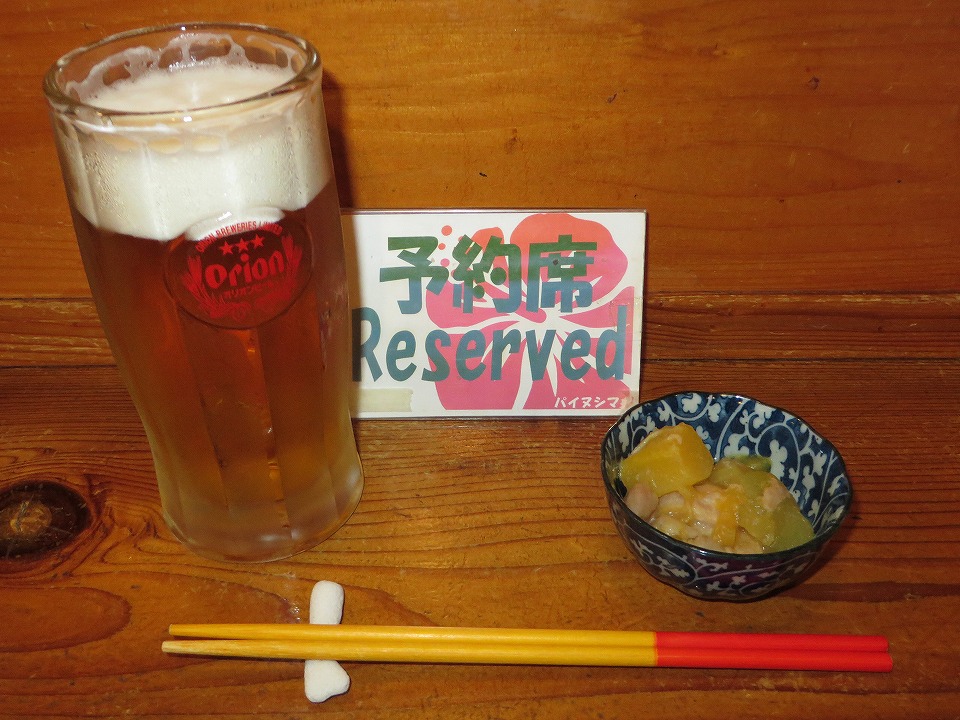 | 夕方になって、「南の島」で呑む。 今日の箸置きは上地島のオキゴンドウの近くで拾ってきたもの。 |