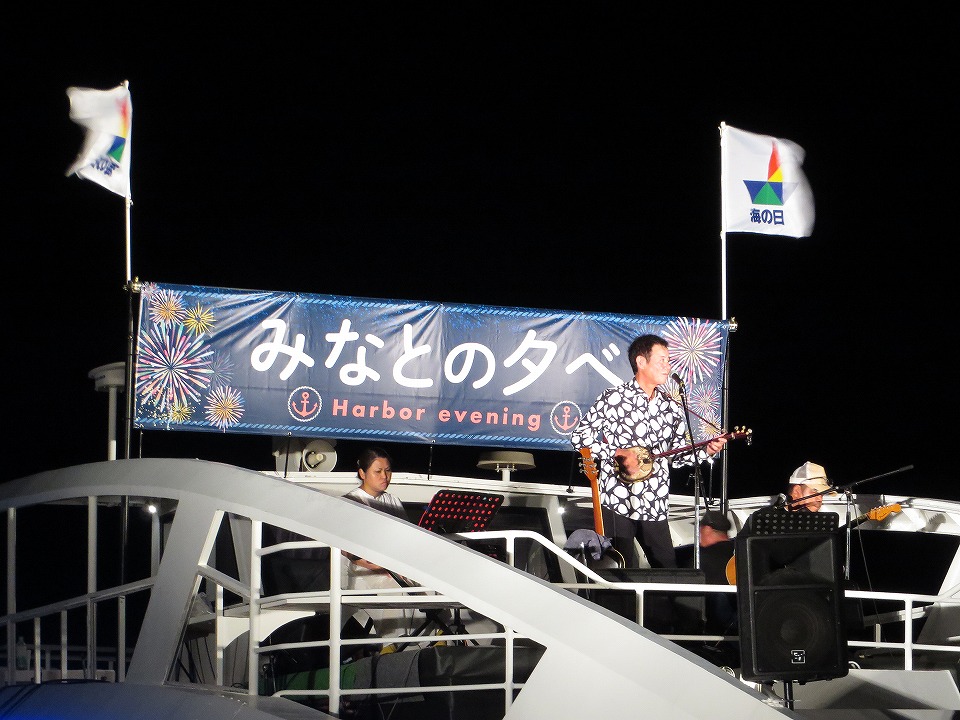 | 十分に満足して店を出たら、今日は「石垣港みなとまつり」だった。 旧離島桟橋付近にはたくさんの人がいて、ちょうどミヤギマモルさんのライブをやっていた。 |