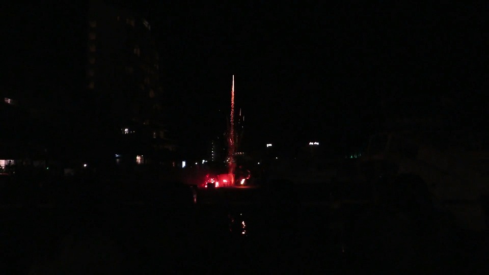 | まつりの〆は花火…はいいんだけど、オトナの事情であんまり大きな規模でできないらしく、 「ご家庭用」花火の豪華版的な内容だった。 でも、観客からは「がんばれ」という声援も上がり、なんかうるうるきちゃったよ。 あんまりうまく撮れていない約50秒の動画はこちら(花火自体はもう数分ガンバってたよ。)。 この後、宿に帰ってチンボツ。 |