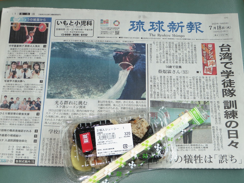 | 無事に那覇に着いた。ここで約1時間半の乗り継ぎ時間があるので、 地元紙を買い込み、じゅーしーおむすびを喰いながらのんびり読む。 スク漁シーズン到来だってさ。 |