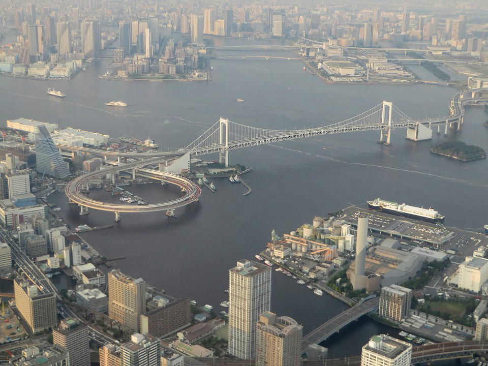 | 那覇からはJAL914便で羽田に向かう。 今回初めて江東〜足立〜豊島(池袋)〜東京タワーと都心上空を通る「新飛行経路」だった。 この経路の採用計画時は、東京新聞が結構噛み付いていたっけな〜。 飛行機から見る景色としてはおもしろかったよ。 写真は「レインボーブリッジ」(東京港連絡橋)。 |