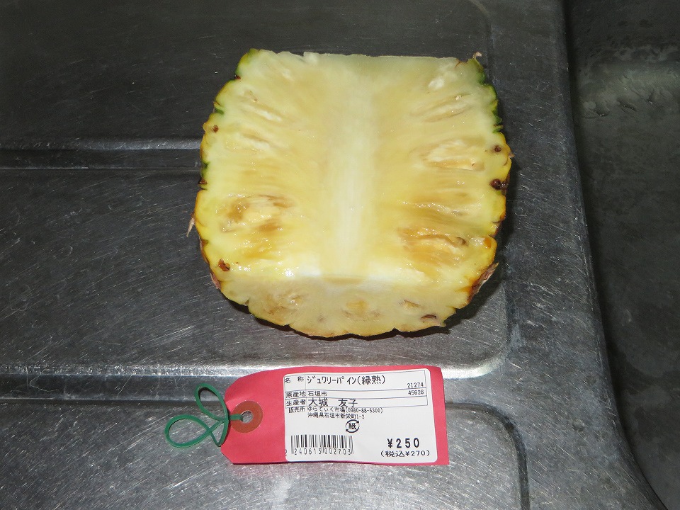 | 民宿に帰ってきて、冷蔵庫で冷やしていたパインを喰う。 昨日までに既に半分を喰っていて、今日はその残り。 甘いよ〜。 |