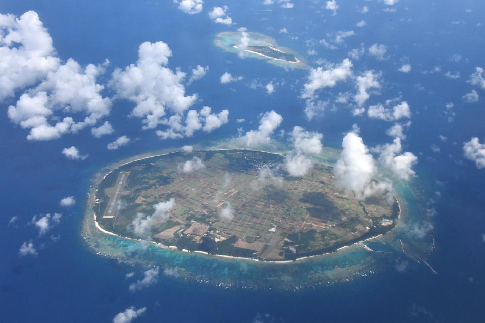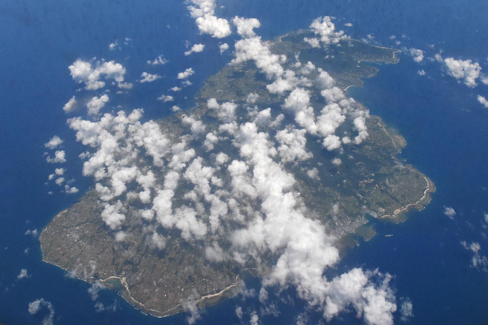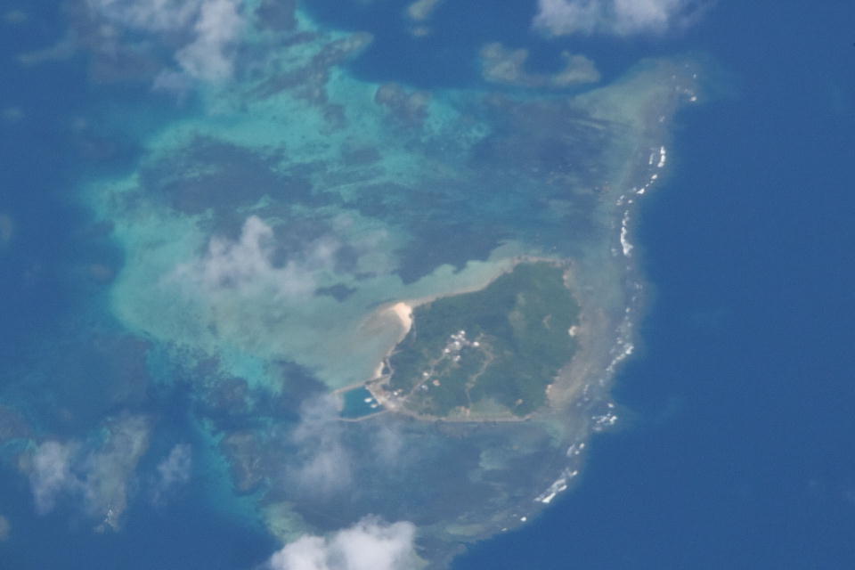 | 粟国島。 上空には雲があり、雨が降っていると思われる。 |