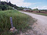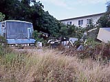 | はいむるぶし上空。 | はいむるぶしの入口。 | 入口の横にデンとある。 | 小浜島の一大リゾート施設。 | ちょっと裏に回ったら、施設の廃棄物がいっぱいあった…。 | ぽつんと売り地。 |