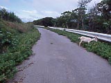| 民宿「うふだき荘」の名物「黒糖アイス」。旨いよ。 | 浜にいたカニさん。 | ヤギの死体も転がっていた。この写真は載せようかどうしようか迷った。が、記録として載せることにした。 | トラックの廃車。 | 写真ではよく見えないけど、首輪のロープは道の左側にくくりつけてあるので、ヤギが右側にいるってことは、ロープが道に横に張られているようになっているわけで、バイクでは通れません。 | 島の最高峰の「大岳(うふだき)」から、北方向を望む。標高99mの頂上に展望台がある。登山道はなんと麓からまっすぐ! 5分ほどで着く。 |