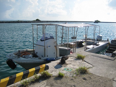 高速船の桟橋のすぐ横にボートを係留している。 そのため、黒島に到着後すぐに潜る場合は 荷物はお店には持って行かず、ボートに積む。 |