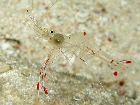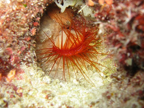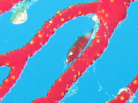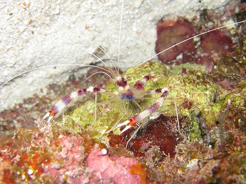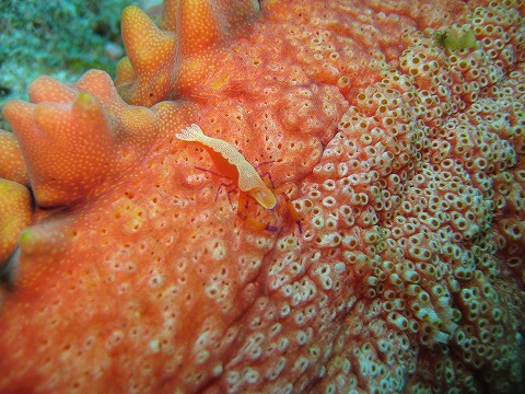 | 2本目は、マンツーマンなのをいいことに、 砂地でひたすら貝を拾わせてもらった。 嬉しい嬉しい。 この写真は、EX途中で見つけたイソバナカクレエビ? |