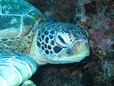 | 2本目はカメポイント。 このアオウミガメは、相当近寄っても逃げなかった。 そんなに眠かったのか(笑)。 |